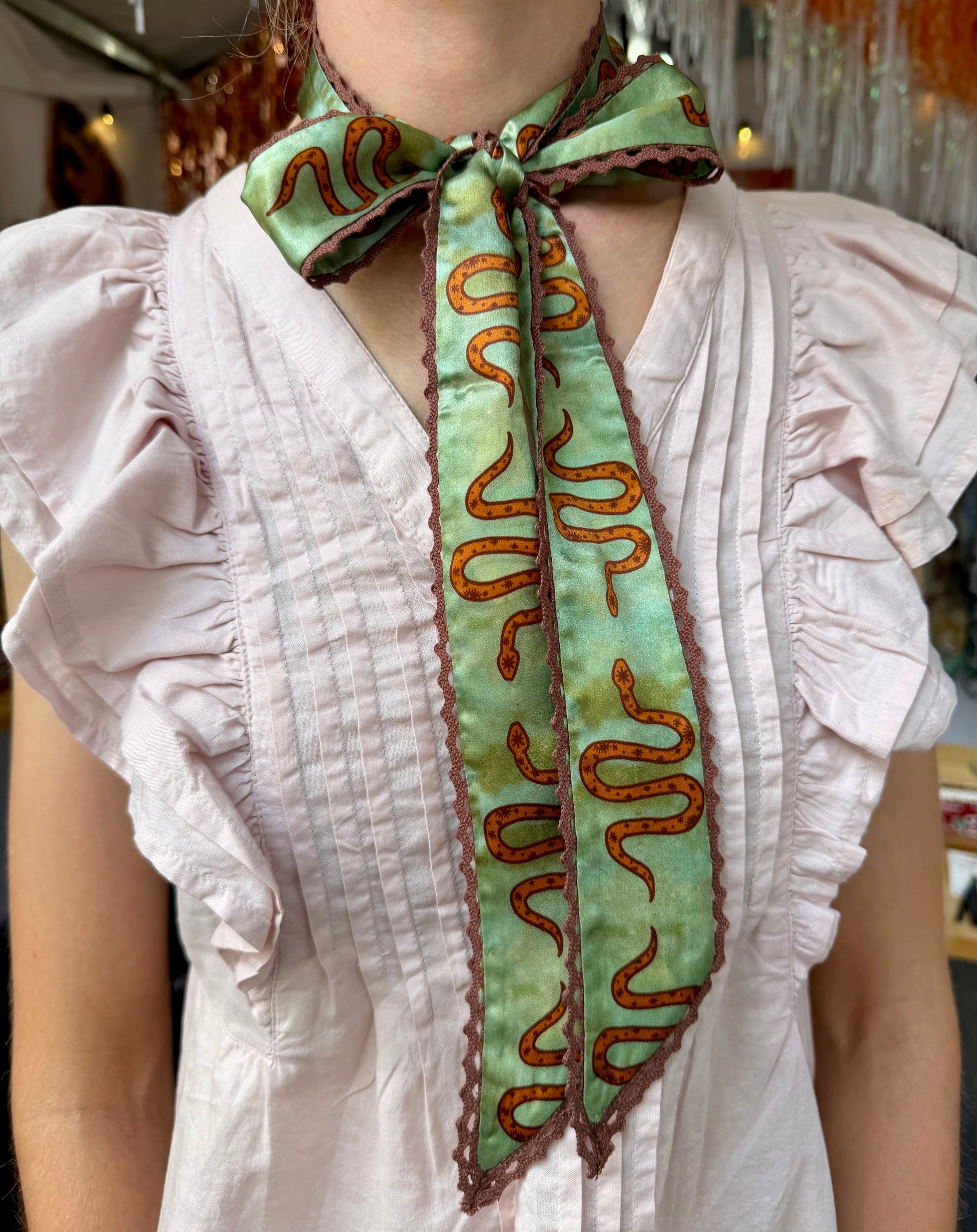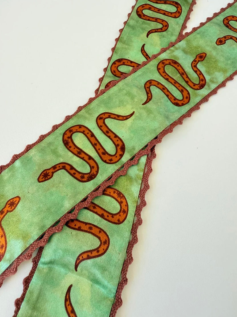 Hand drawn art on a beautiful silk twilly with a crochet trimmed edge.